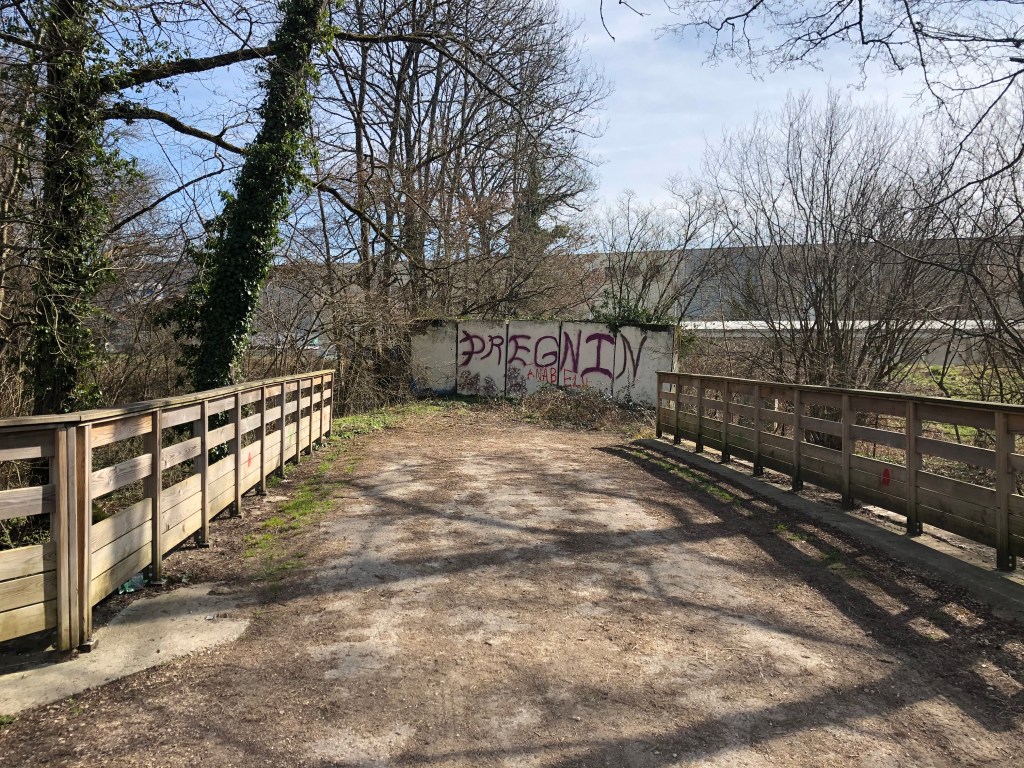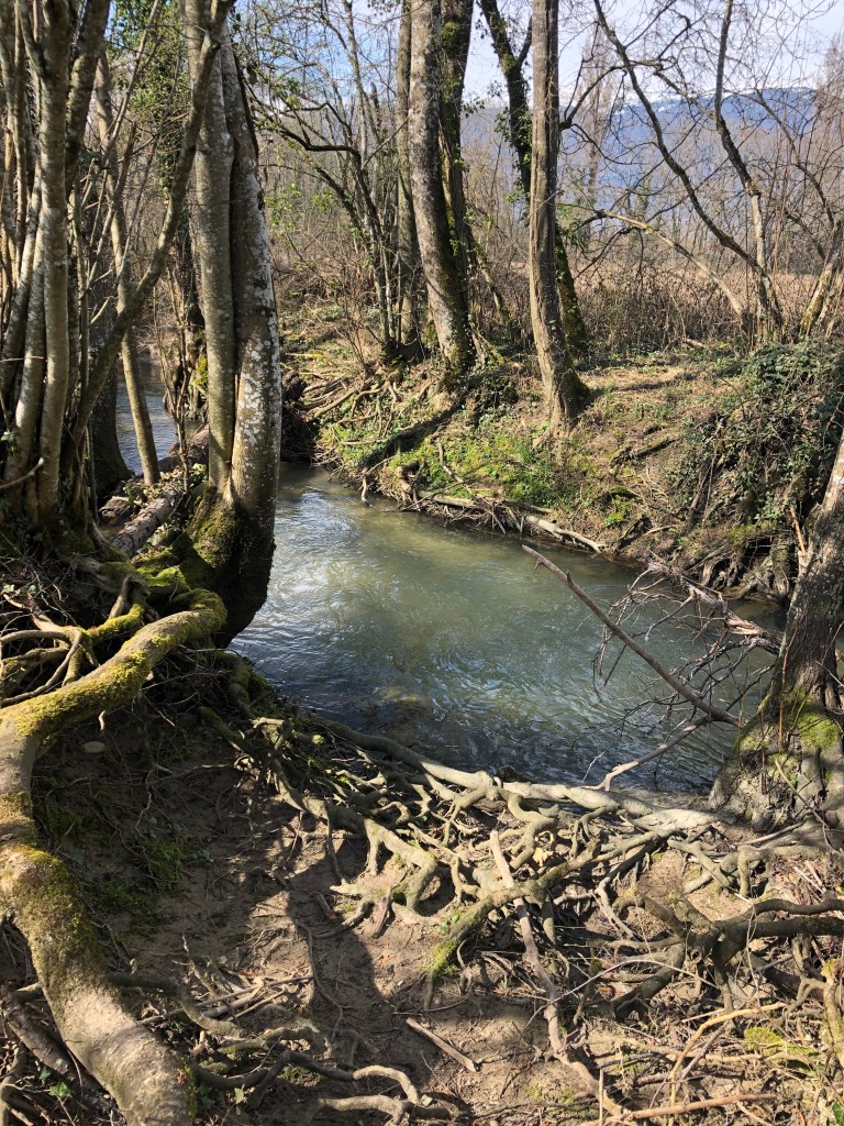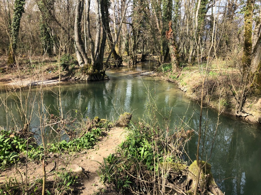 Now, walk until you see a bridge on your left side. Cross the bridge and you will see a small pathway that takes you along the river Le lion. In the springtime when there is plenty of water you may come across one or two people fishing.