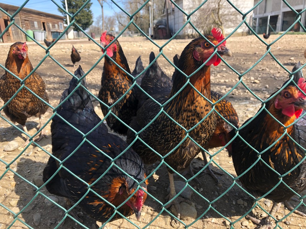 Where the pathway joins the road, continue to the right, and soon you will be walking past a small farm with chickens, horses and cows.