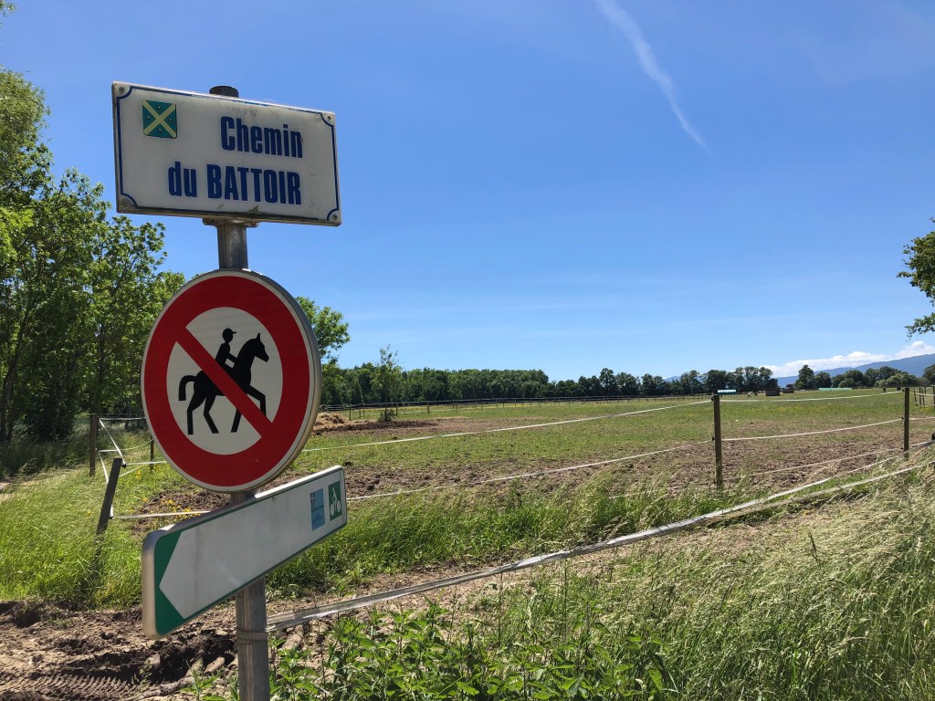 Follow the trail into the forest until you come to a crossing with a wide path, then take left. Follow this path across the fields until you come to a new crossing and spot the sign that says Chemin Battoir.
