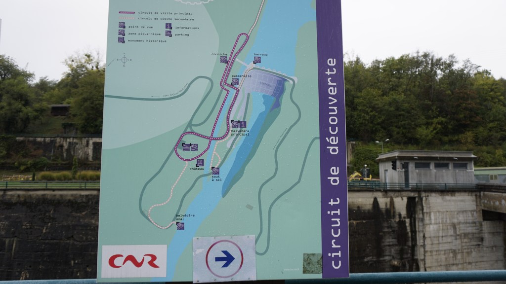 There’s a walkable circuit of some 25 minutes along the dam and the environs, with ample opportunities for picnic and rest. Written explanations are provided in several spots, all in French. Ruins of the old chateau (it must have been very small, but with an impeccable view) can be seen close to the “ski jump” waterfall, and a bit further along there’s a large park-like area where kids and adults can play on a sunny day. A trip well worth doing – and you get to learn something, too!