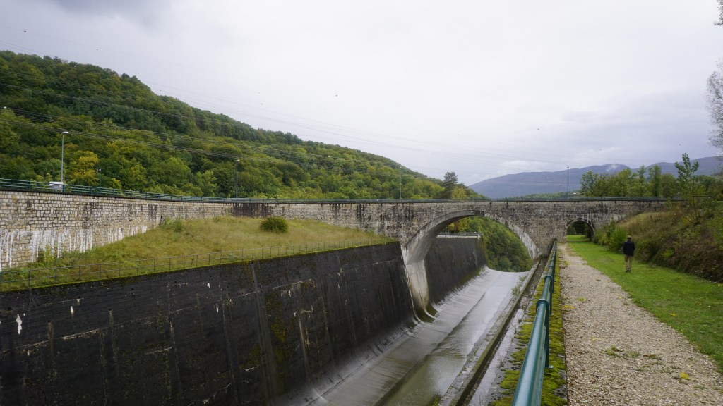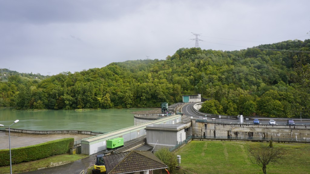 As a sustainable environment project, the Barrage de Genessiat site has been chosen for a pilot project to collect the wood and vegetation floating down the Rhone river. After being collected, the driftwood is transformed into panelling, and the vegetation is transformed into energy. When crossing the dam, you can see huge amounts of wood on the upper side of the barrage (along with all kinds of flotsam and jetsam that people have managed to “loose” in the river…)
