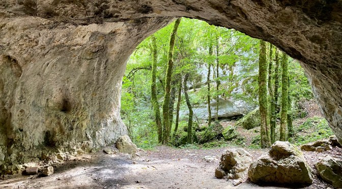 In one of their newsletters from 1963, the Geneva Caving Association mention that archaeologists have found fragments of pottery, bones, and other remains of earlier habitation right here in this cave. The findings show that the cave and the area was used by human beings already during the Bronze age. The newsletter also mentions a megalith a little further up, that was used for religious ceremonies. Today the area around the cave is all quiet and peaceful, but back in the Bronze age the cave and the surroundings were probably bustling with people and voices.