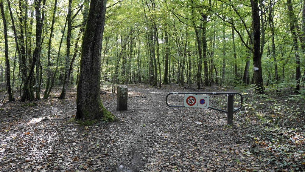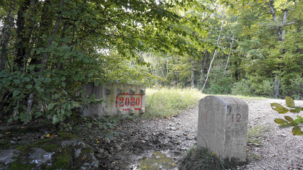 Soon, you’ll be walking past one border stone after another, keep walking until you reach the wide road (Route de Bois-Chatton).