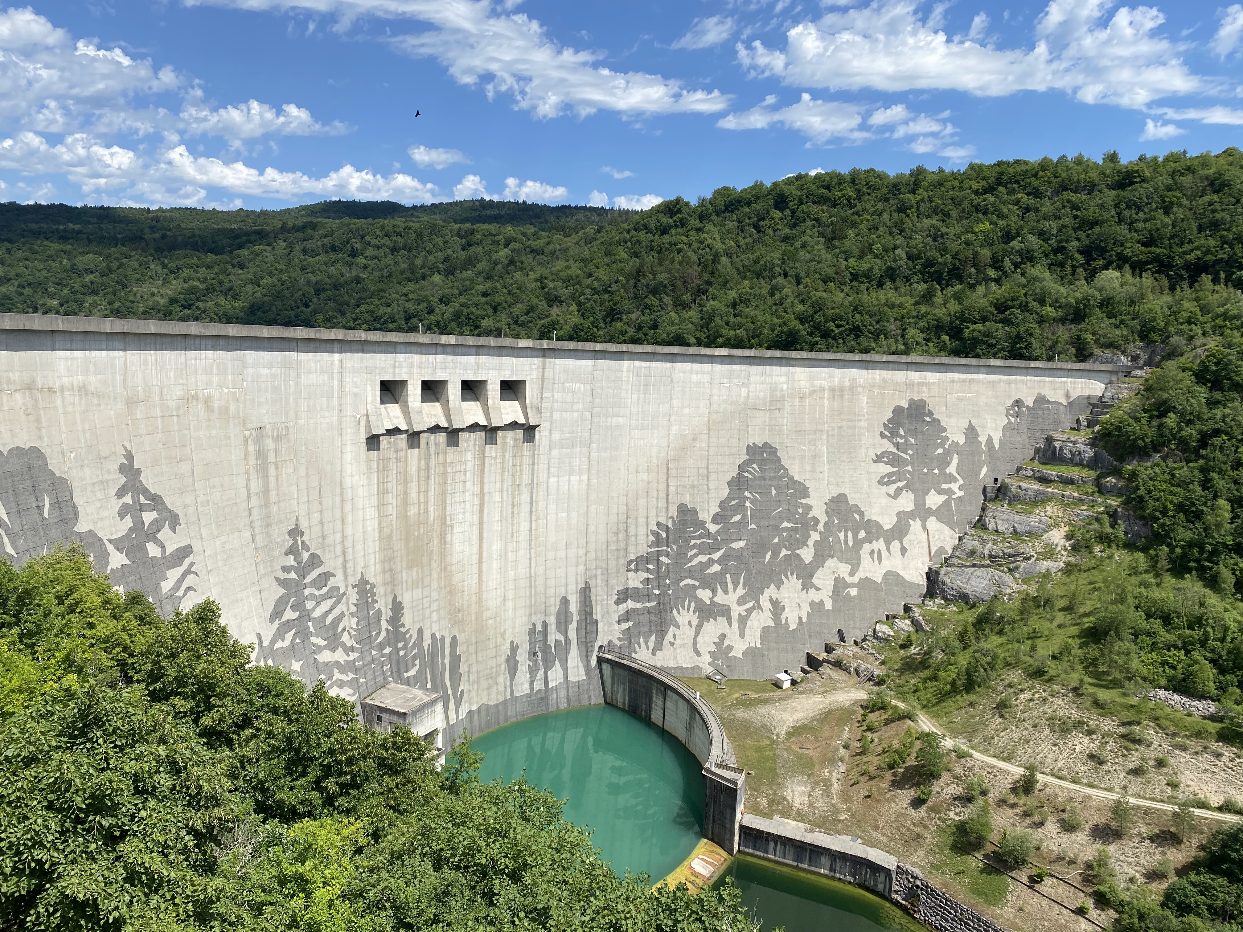 If you still have time and like to explore more, I think you should drive up to the Barrage de Vouglans. With the recent addition of a sand-blown fresco (!) on its front wall, it is truly a sight to behold. When we visited, there was no water passing so I can only imagine how impressive it will be to visit on a day when they actually produce electricity. On-site you’ll find lots of information on the building of the dam (both in French and English). You can also read about the artist who did the mural sand-blasted painting. There is also a viewpoint on the other side of the river that you can access by car, or if you are sporty, walk up from the village below.