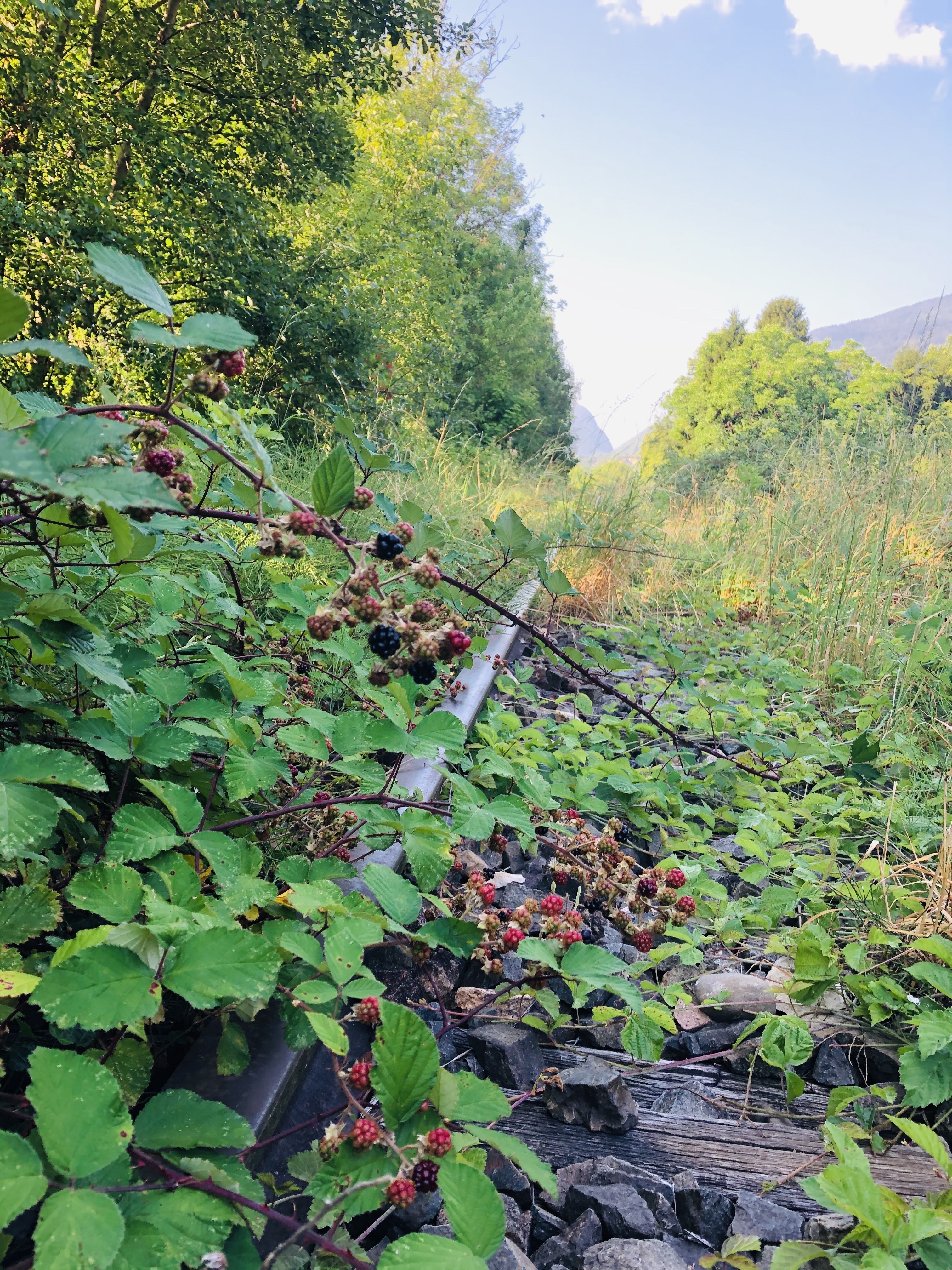 However, today we’ll focus on walking on the real tracks. A railway walk is perfect whatever the weather. However, if you want to explore the parts that have not been transformed into a walking path, I will recommend long socks and trousers. Speaking from experience, I can say that wearing a pair of shorts and short socks is not ideal on overgrown paths with thorn bushes and nettles. But on the upside, from July to September you don’t need to bring a snack with you as you can feast on the delicious blackberries growing in and around the tracks.